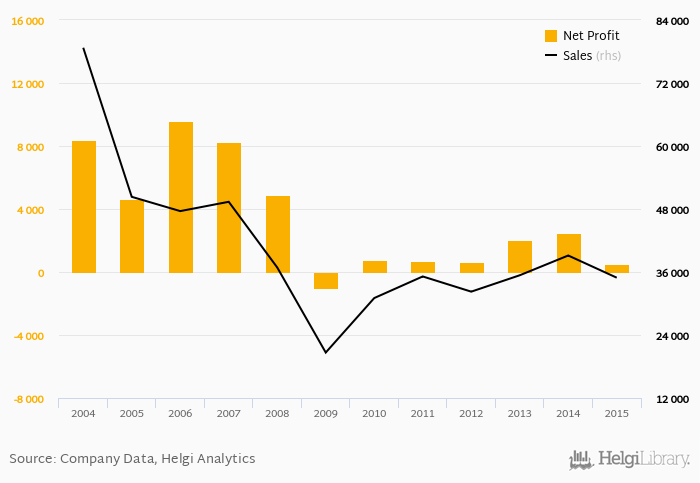 Sales have fallen by 3.59% a year on average since 2005. They reached a high of CZK 78,714 mil in 2004 and a low of CZK 20,657 mil in 2009.