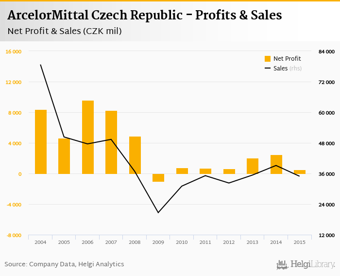 ArcelorMittal Czech Republic made a net profit of CZK 536 mil in 2015, down 78.2% compared to the previous year. Total sales reached CZK 34,916 mil, which is down 10.8% when compared to the previous year.
