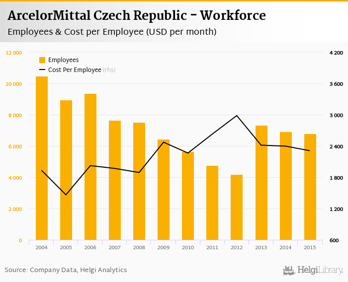 ArcelorMittal Czech Republic employed 6,786 employees in 2015, down 1.98% compared to the previous year. Historically, between 2004 and 2015, the firm's workforce hit a high of 10,490 employees in 2004 and a low of 4,191 employees in 2012.