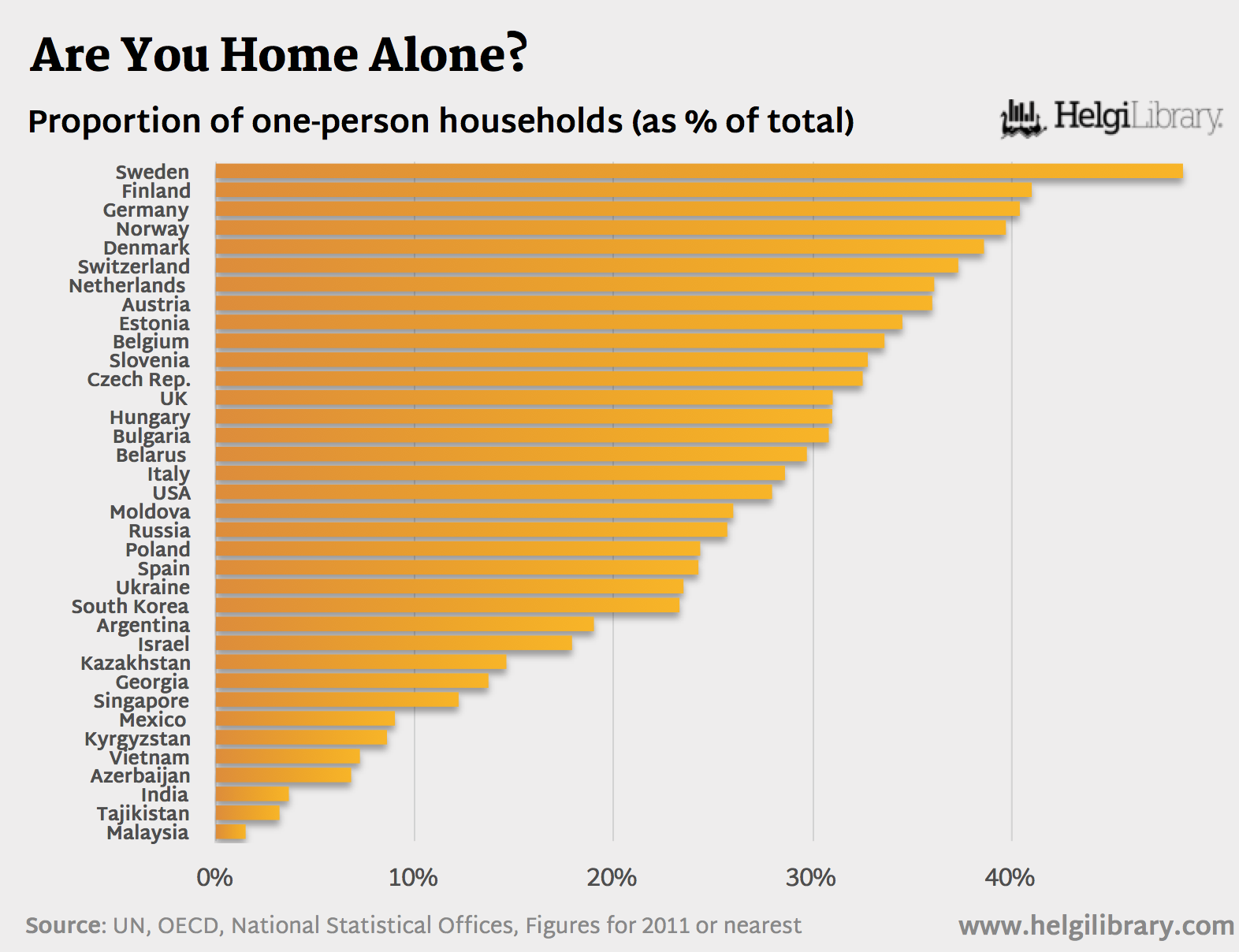 But, it is Scandinavians who seem most lonely with one-person household representing nearly every second family in Sweden, for instance.