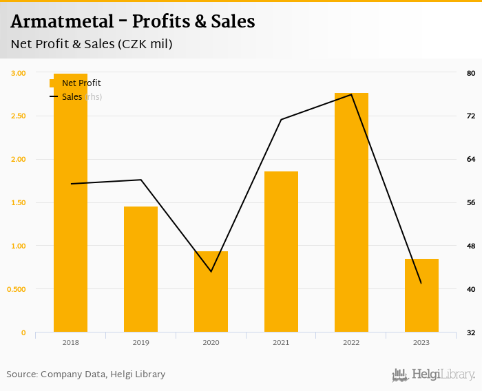 Armatmetal made a net profit of CZK 0.849 mil in 2023, down 69.4% compared to the previous year. Total sales reached CZK 40.9 mil, which is down 46.1% when compared to the previous year.