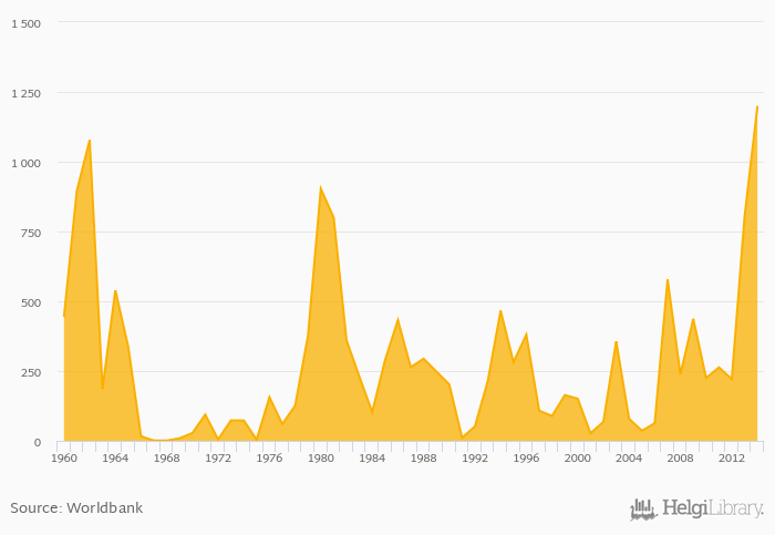 Historically, arms imports at constant USD prices from 1990 in Indonesia reached an all time high of USD 1,200 mil in 2014 and an all time low of USD 1.00 mil in 1968.
