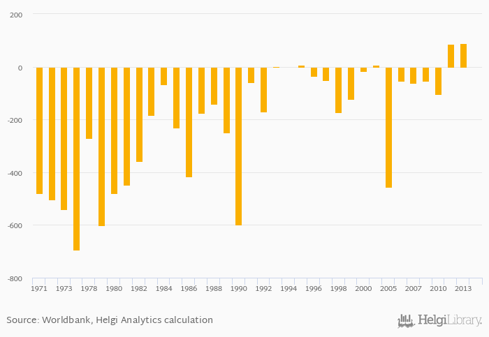 Historically, net arms exports at constant USD prices from 1990 in Romania reached an all time high of USD 88.0 mil in 2013 and an all time low of USD -694 mil in 1974.