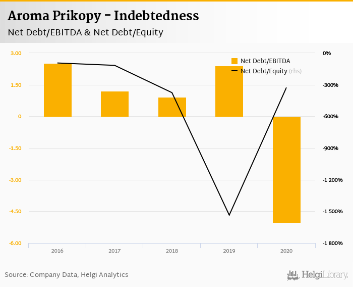 Aroma Prikopy's net debt stood at CZK 14.5 mil and accounted for -324% of equity at the end of 2020. The ratio is up 1,211 pp compared to the previous year.