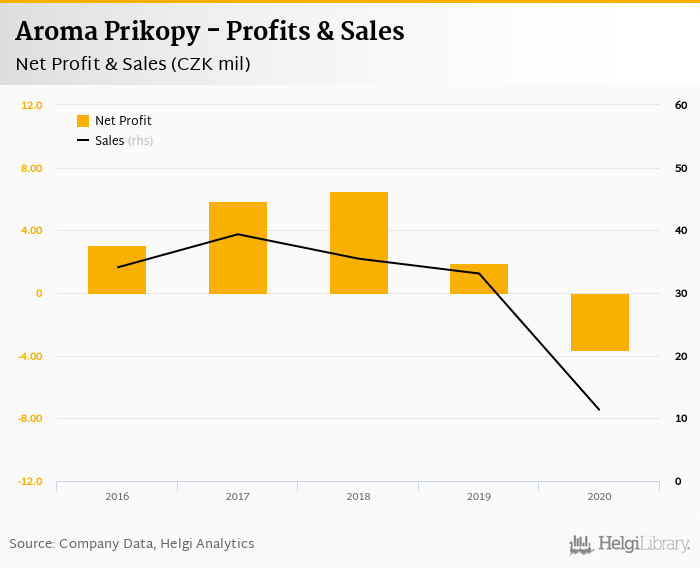 Aroma Prikopy made a net profit of CZK -3.67 mil in 2020, down 294% compared to the previous year. Total sales reached CZK 11.3 mil, which is down 65.9% when compared to the previous year.