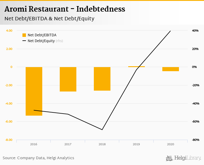 Aromi Restaurant's net debt stood at CZK 1.55 mil and accounted for 39.7% of equity at the end of 2020. The ratio is up 43.0 pp compared to the previous year.