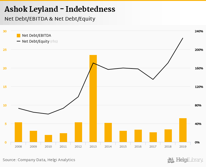 Ashok Leyland's net debt stood at INR 200 bil and accounted for 225% of equity at the end of 2019. The ratio is up 54.2 pp compared to the previous year.