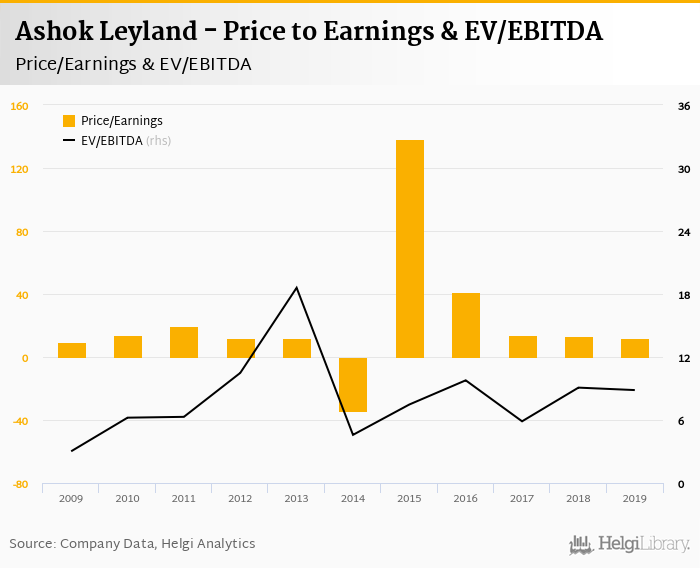 Ashok Leyland stock traded at INR 87.1 per share at the end 2019 translating into a market capitalization of USD 3,866 mil.