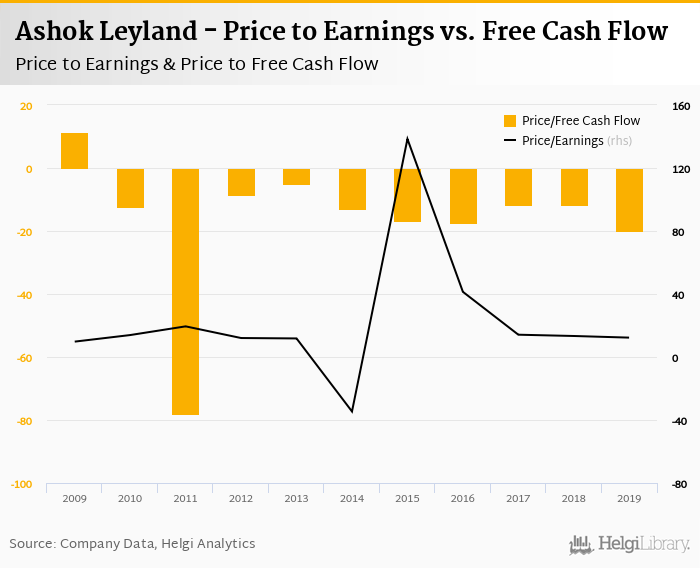 Regarding cash generated defined by the sum of net profit and depreciation, the stock traded at 27.3x at the end of 2019. When investments are excluded to get free cash flow, Ashok Leyland traded at -20.0x.