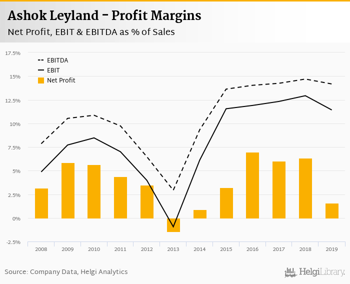 Ashok Leyland made a net profit of INR 3.37 bil with revenues of INR 217 bil in 2019, down by 83.8% and down by 33.6%, respectively, compared to the previous year.
