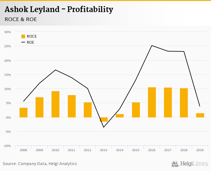 Ashok Leyland made a net profit of INR 3.37 bil in 2019, down 83.8% compared to the previous year. Historically, between 2008 and 2019, the company's net profit reached a high of INR 20.8 bil in 2018 and a low of INR -1.64 bil in 2013.