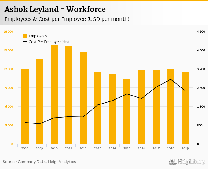 Ashok Leyland employed 11,463 employees in 2019, down 4.2% compared to the previous year. Historically, between 2008 and 2019, the firm's workforce hit a high of 15,812 employees in 2010 and a low of 10,352 employees in 2015.