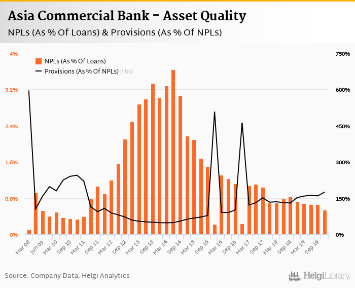 Asia Commercial Bank's non-performing loans reached 0.539% of total loans at the end of 2019-12-31, down from 0.727% compared to the previous year. Historically, the NPL ratio hit an all time high of 3.65% in 2014-06-30 and an all time low of 0.101% in 2008-03-31.