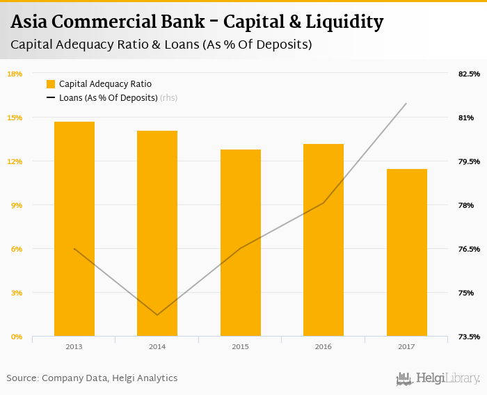 Asia Commercial Bank's capital adequacy ratio reached 11.5% at the end of 2017, down from 13.2% compared to the previous year. Historically, the bank’s capital ratio hit an all time high of 14.7% in 2013 and an all time low of 11.5% in 2017.