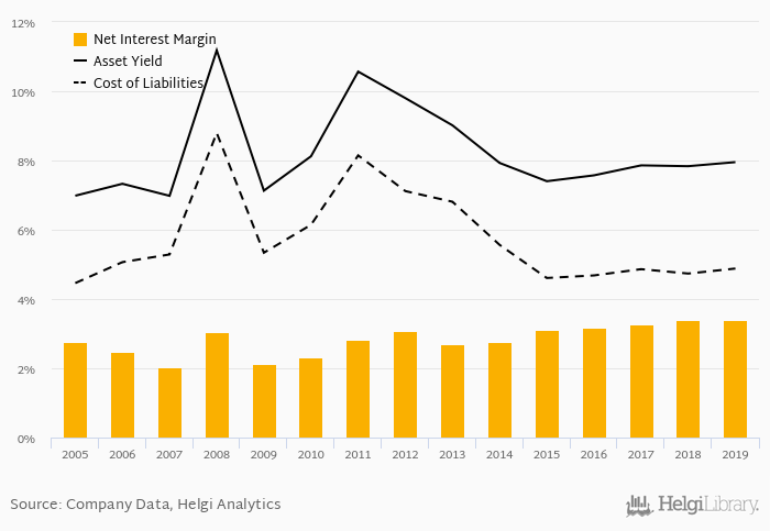 Historically, the bank’s net interest margin reached an all time high of 3.41% in 2019 and an all time low of 2.02% in 2007. The average margin in the last five years amounted to 3.27%.