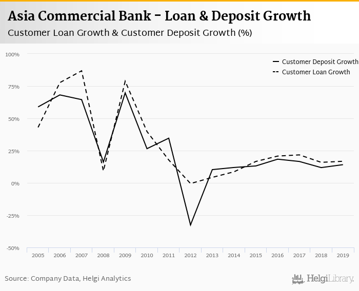 Asia Commercial Bank's customer loan growth reached 16.7% in 2019, up from 15.9% compared to the previous year. Historically, the bank’s loans growth reached an all time high of 86.8% in 2007 and an all time low of -0.501% in 2012. In the last decade, the average annual loan growth amounted to 15.7%.