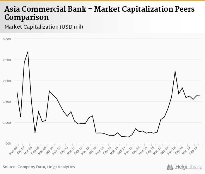 Asia Commercial Bank stock traded at VND 22,800 per share at the end of fourth quarter of 2019 implying a market capitalization of USD 1,630 mil.