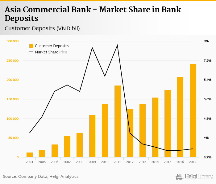 Asia Commercial Bank accounted for 3.54% of all customer deposits taken by banks in Vietnam at the end of 2017. Historically, the bank’s market share in customer deposits reached an all time high of 7.83% in 2011 and an all time low of 3.47% in 2015.