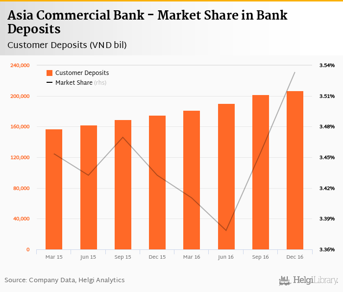 Asia Commercial Bank's customer deposits reached VND 207,051 bil in 2016-12-31, up 2.81% compared to the previous year.