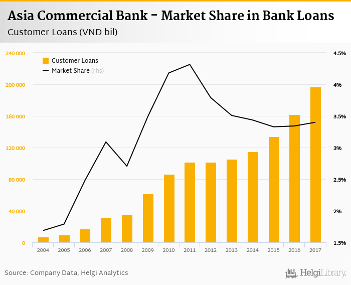 Asia Commercial Bank accounted for 3.40% of all customer loans issued in Vietnam at the end of 2017. Historically, the bank’s market share in customer loans reached an all time high of 4.31% in 2011 and an all time low of 1.69% in 2004.