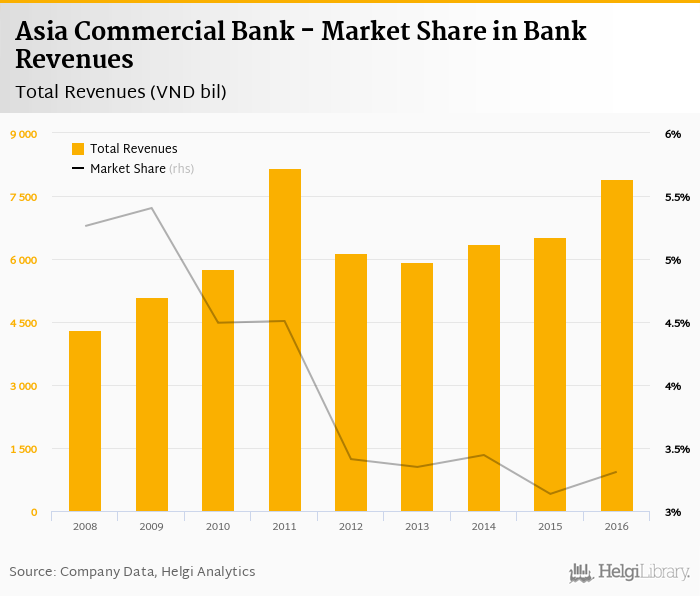 As a result, Asia Commercial Bank accounted for 3.31% of all bank revenues generated by banks in Vietnam in 2016. Historically, the bank’s market share in total revenues reached an all time high of 5.40% in 2009 and an all time low of 3.14% in 2015.