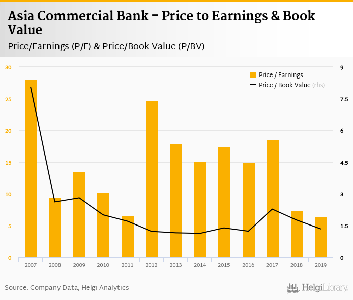 Asia Commercial Bank stock traded at VND 22,800 per share at the end 2019 implying a market capitalization of USD 1,630 mil.