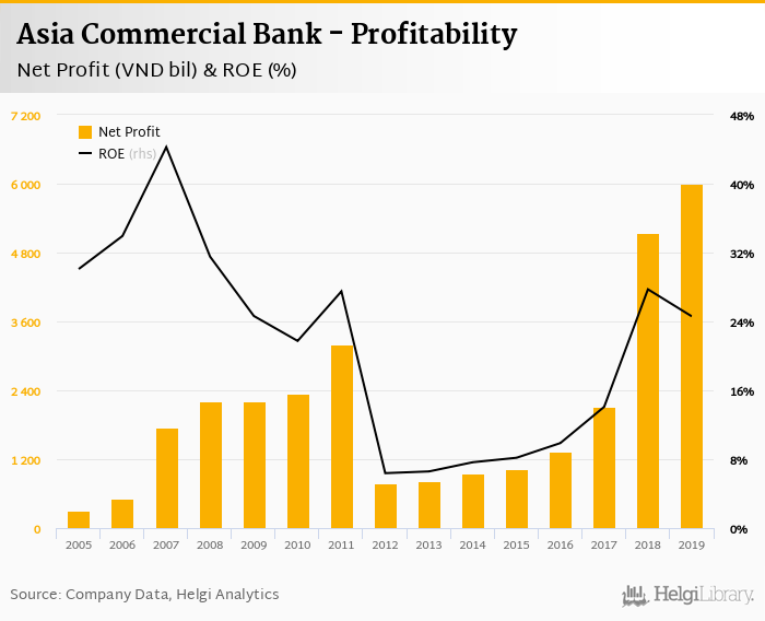 Asia Commercial Bank made a net profit of VND 5,997 bil in 2019, up 16.7% compared to the previous year. This implies a return on equity of 24.6%.