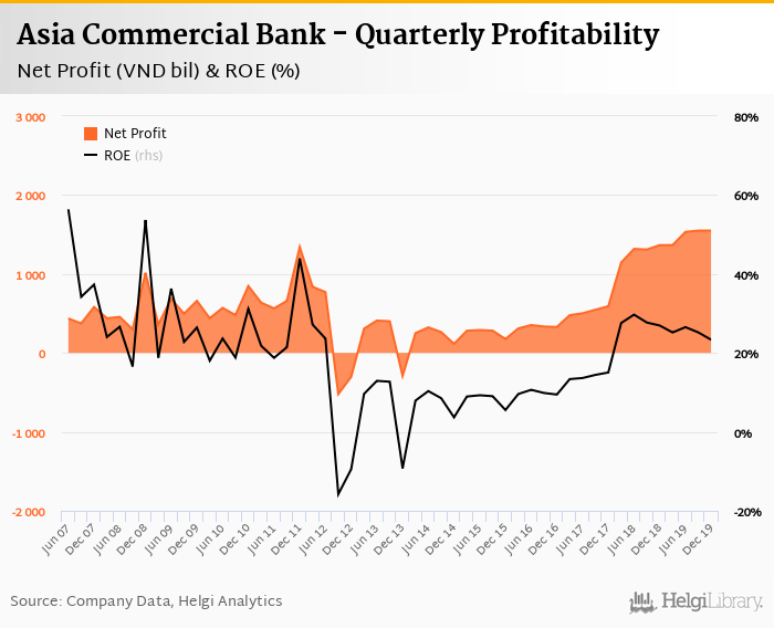 Asia Commercial Bank made a net profit of VND 1,549 bil in the fourth quarter of 2019, up 13.5% when compared to the same period of last year. This implies a return on equity of 23.3%.