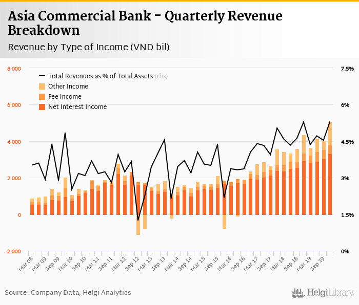 Asia Commercial Bank generated total banking revenues of VND 5,096 bil in the fourth quarter of 2019, up 17.2% when compared to the same period of last year and 25.5% when compared to the previous quarter.
