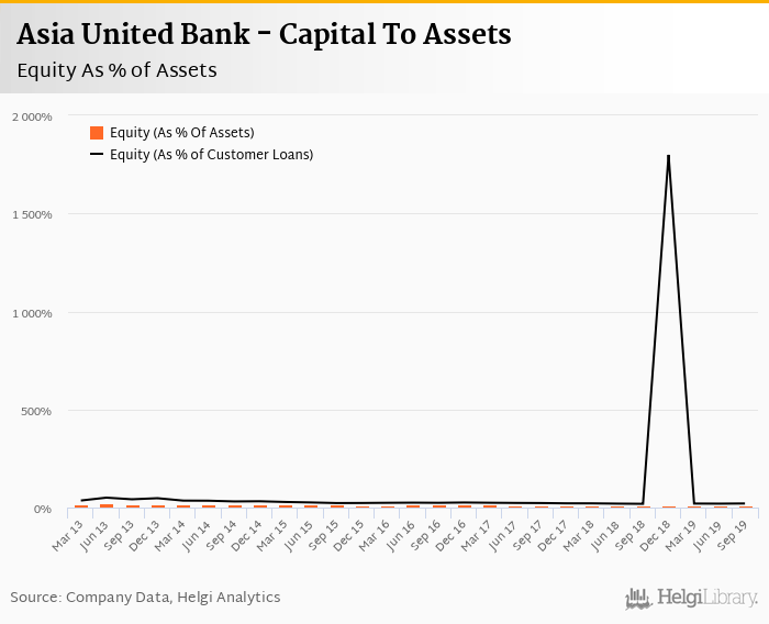 Asia United Bank's Equity reached 12.1% of total assets in the 3Q2019, up from 12.0% for the previous year. As a share of net customer loans, the ratio amounted to 20.7% at the end of the third quarter of 2019.
