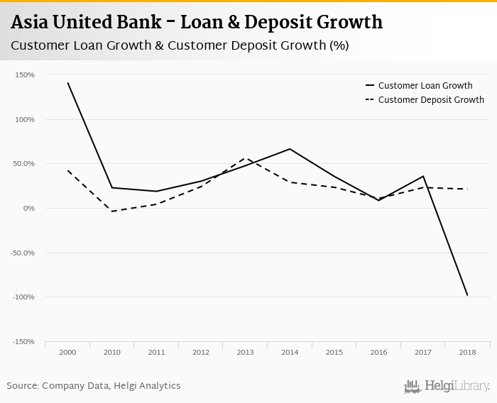Asia United Bank's customer loan growth reached -98.7% in 2018, down from 35.5% compared to the previous year. Historically, the bank’s loans growth reached an all time high of 141% in 2000 and an all time low of -98.7% in 2018. In the last decade, the average annual loan growth amounted to 0%.