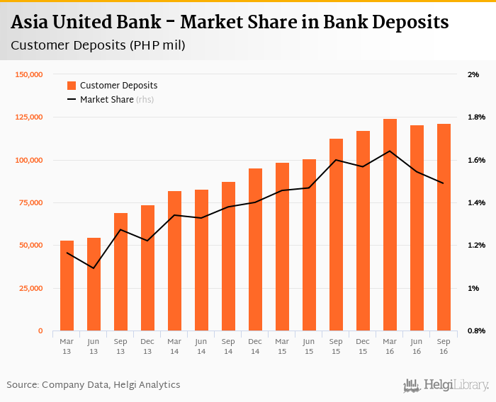 Asia United Bank accounted for 1.49% of all customer deposits taken by banks in Philippines at the end of 2016-09-30. Historically, the bank’s market share in customer deposits reached an all time high of 1.64% in 2016-03-31 and an all time low of 1.09% in 2013-06-30.