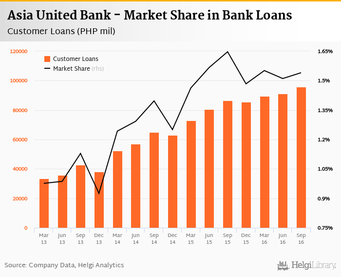Asia United Bank's customer loans reached PHP 95,779 mil in 2016-09-30, up 4.92% compared to the previous year.