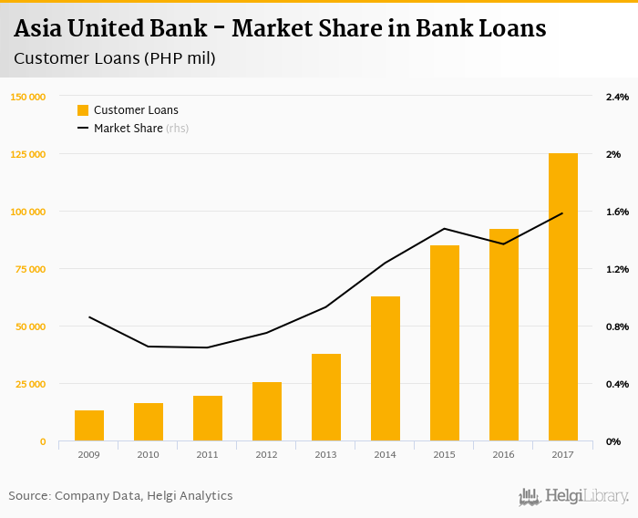 Asia United Bank's customer loans reached PHP 125,348 mil in 2017, up 35.5% compared to the previous year.