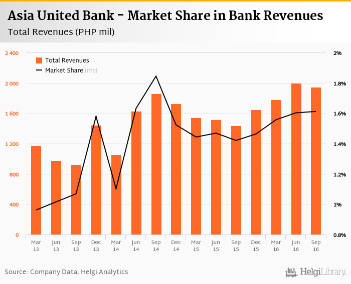 Asia United Bank generated total banking revenues of PHP 1,945 mil in 2016-09-30, down 2.71% compared to the previous year.