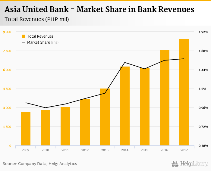 Asia United Bank generated total banking revenues of PHP 8,435 mil in 2017, up 11.4% compared to the previous year.