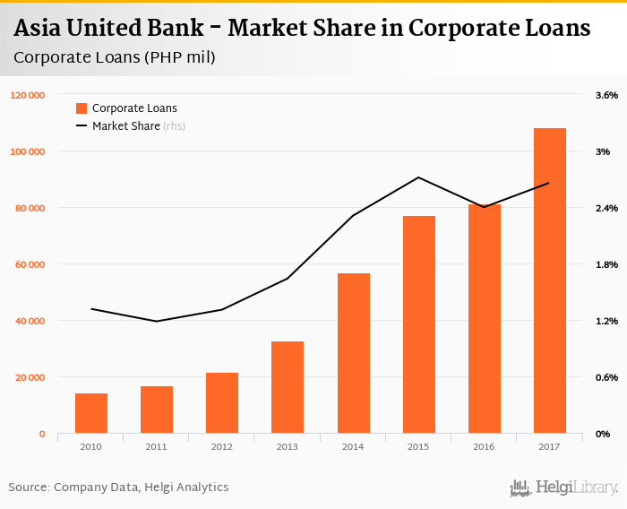 Asia United Bank's corporate loans reached PHP 108,409 mil in 2017, up 33.6% compared to the previous year.