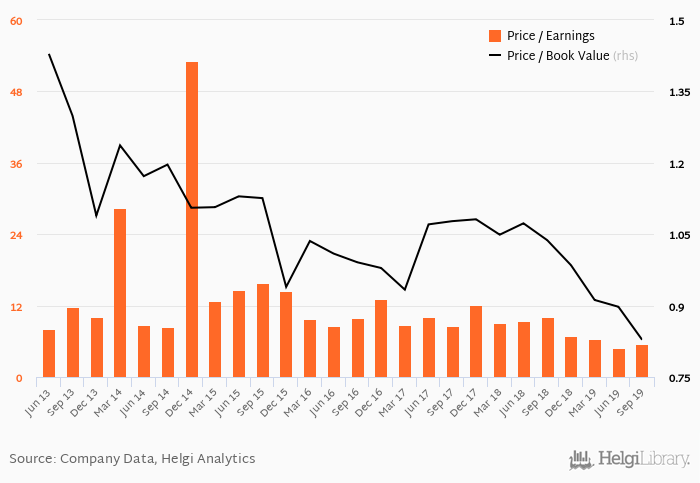 At the end of 3Q2019, the bank traded at price to earnings of 5.56x. Within the last five years, the multiple reached an all time high of 53.1x in 4Q2014 and an all time low of 4.85x in 2Q2019 with an average of 12.2x.