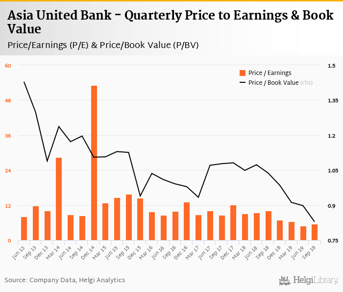 Asia United Bank stock traded at PHP 56.0 per share at the end third quarter of 2019 implying a market capitalization of USD 524 mil.