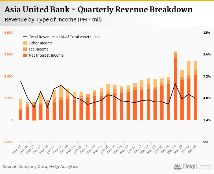 Asia United Bank generated total banking revenues of PHP 3,224 mil in the third quarter of 2019, up 36.2% when compared to the same period of last year and down 0.944% when compared to the previous quarter.