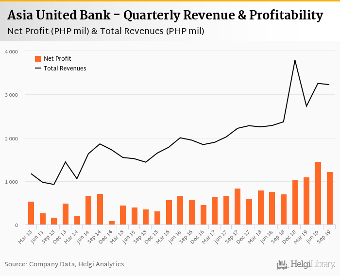 Asia United Bank made a net profit of PHP 1,223 mil under revenues of PHP 3,224 mil in the third quarter of 2019, up 72.1% and 36.2% respectively when compared to the same period last year.