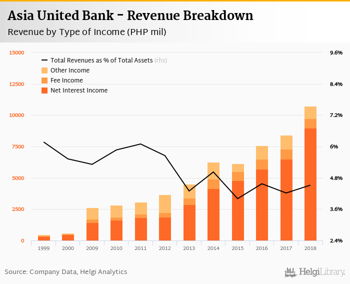 Asia United Bank generated total banking revenues of PHP 10,741 mil in 2018, up 27.3% compared to the previous year.