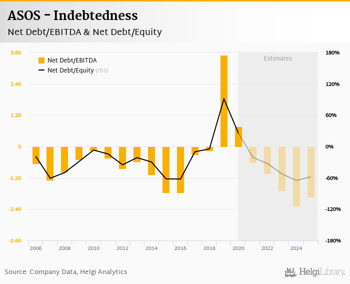 ASOS's net debt stood at GBP 238 mil and accounted for 25.7% of equity at the end of 2020. The ratio is down 65.4 pp compared to the previous year.