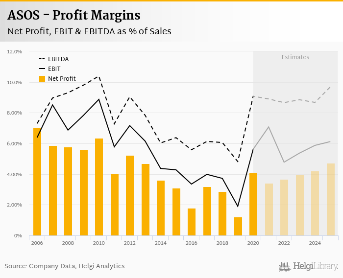 ASOS made a net profit of GBP 143 mil with revenues of GBP 3,453 mil in 2020, up by 312% and up by 20.1%, respectively, compared to the previous year.