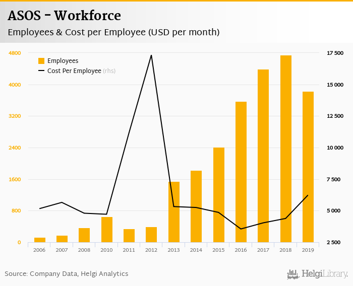 ASOS employed 3,824 employees in 2019, down 19.6% compared to the previous year. Historically, between 2006 and 2019, the firm's workforce hit a high of 4,755 employees in 2018 and a low of 131 employees in 2006.
