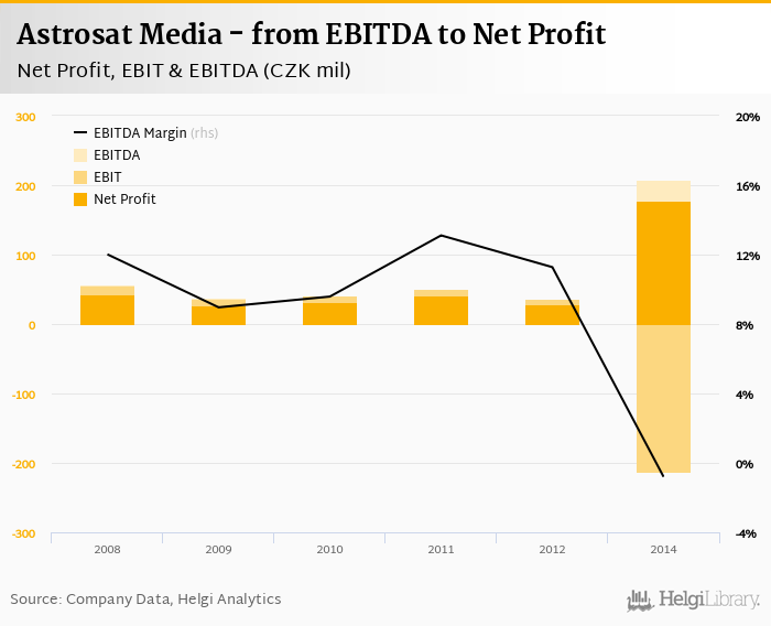 Astrosat Media made a net profit of CZK 178 mil with revenues of CZK 560 mil in 2014, up by 0% and up by 0%, respectively, compared to the previous year. This translates into a net margin of 31.9%.