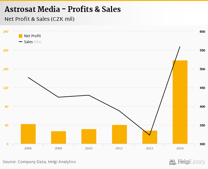 Astrosat Media made a net profit of CZK 178 mil in 2014, up 0% compared to the previous year. Total sales reached CZK 560 mil, which is up 0% when compared to the previous year.