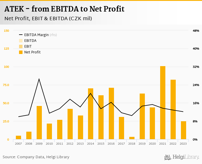ATEK made a net profit of CZK 25.1 mil with revenues of CZK 1,138 mil in 2023, down by 69.4% and up by 0.922%, respectively, compared to the previous year. This translates into a net margin of 2.21%.