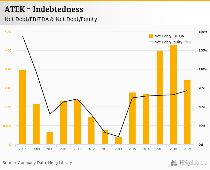 ATEK's net debt stood at CZK 396 mil and accounted for 85.6% of equity at the end of 2019. The ratio is up 6.56 pp compared to the previous year.