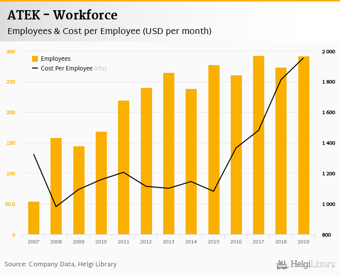 ATEK employed 292 employees in 2019, up 6.57% compared to the previous year. Historically, between 2007 and 2019, the firm's workforce hit a high of 293 employees in 2017 and a low of 54.0 employees in 2007.